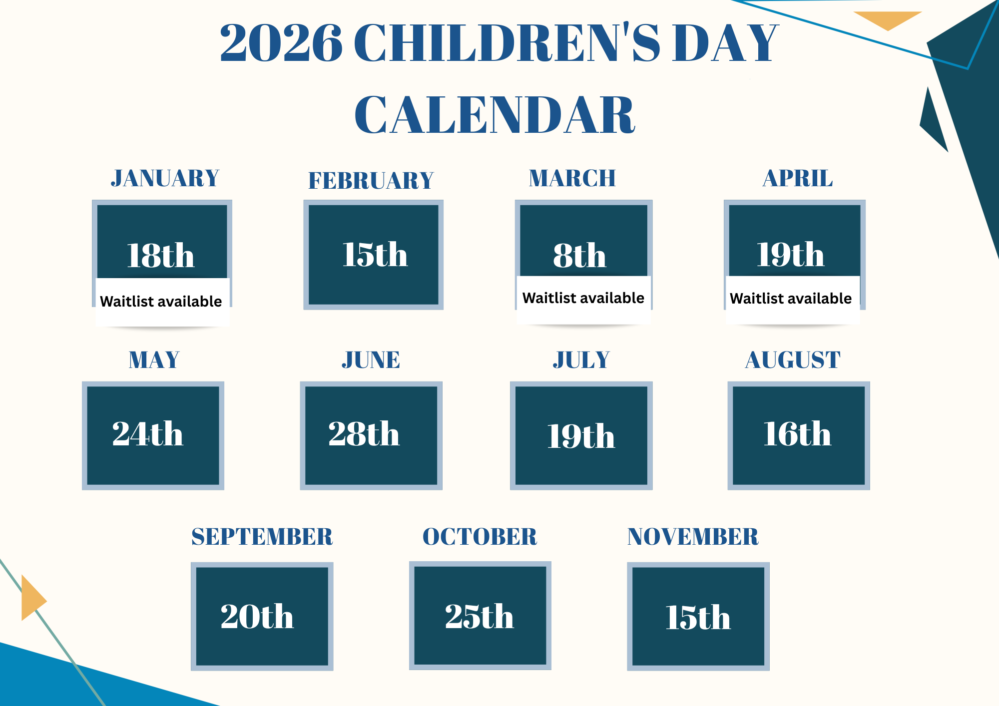 Here are the 2026 dates for the Children’s DayOnce you have chosen your date, click the email link to book with me. Email me Email me Back to Children Services Page